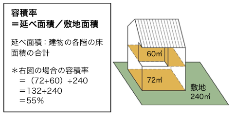 132㎡(延床面積)÷240㎡(敷地面積)×100=55%(容積率)