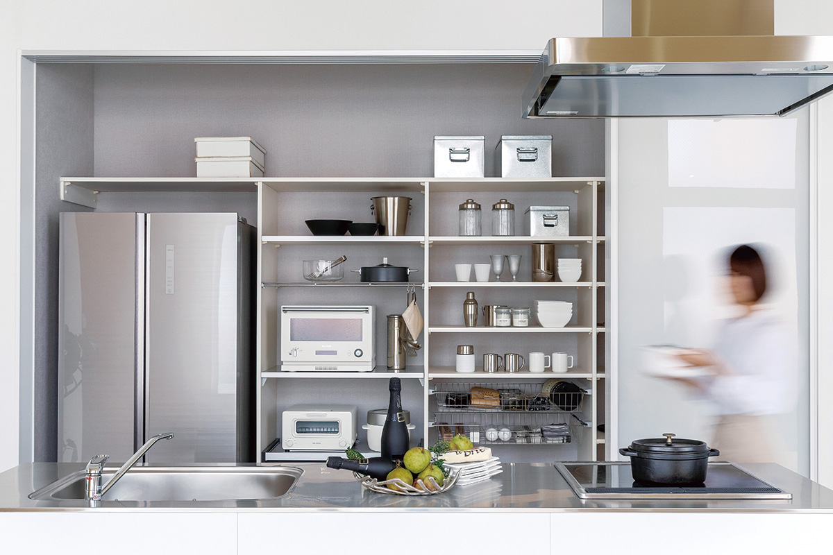 食器や調理家電から冷蔵庫までを収納することができるので、扉を閉めるだけで生活感が隠せ、見た目がスッキリとします。 扉を開ければ食器をサッと出し入れでき、料理もはかどります!目次