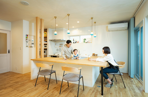 ダイニングやリビングを中心に、家族が自然と集まり、会話や笑顔が広がる間取り。暮らしの動線にも配慮し、日常をより快適に過ごせる工夫を施しています。