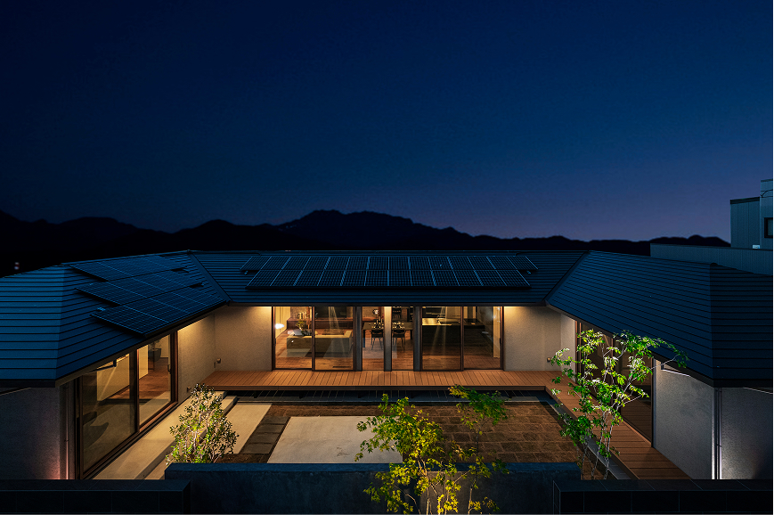 中庭を囲むコの字型の平屋。家のどこからでも中庭を望める配置で、家に居ながら四季の移ろいを感じられます。