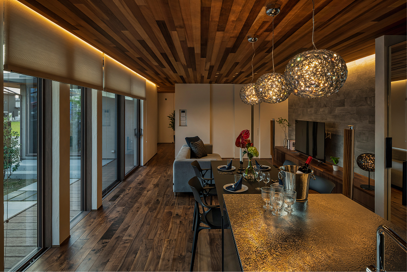 床材にはブラックウォルナット、壁には漆喰を採用し、細部にまでこだわりが詰まっています。