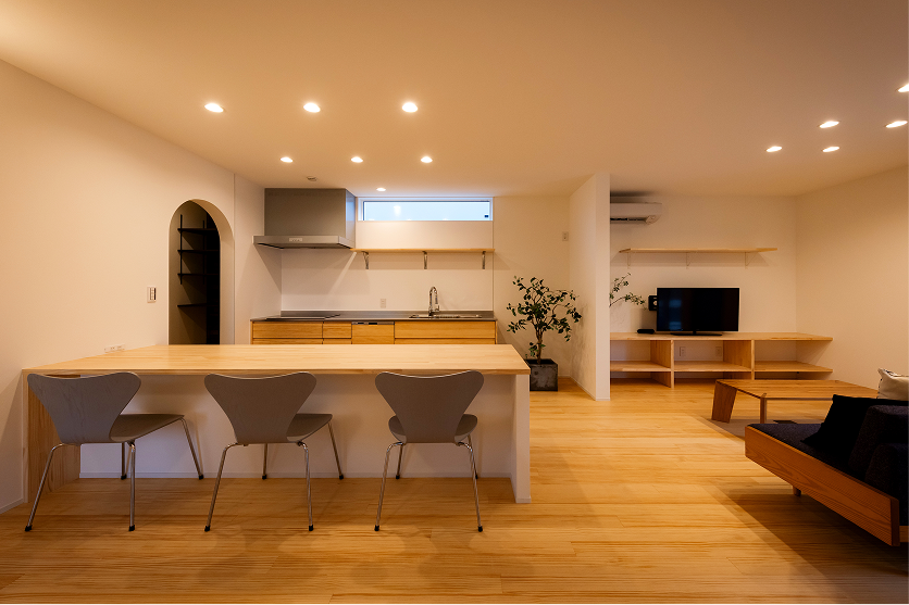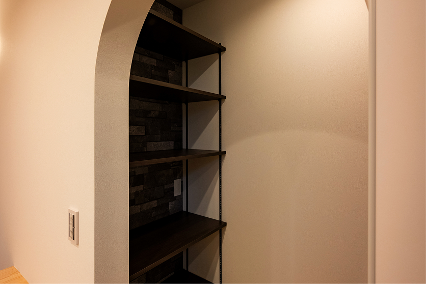横にはアーチ型の入り口が印象的なパントリーを設け、機能的でありながら遊び心のあるデザインに。