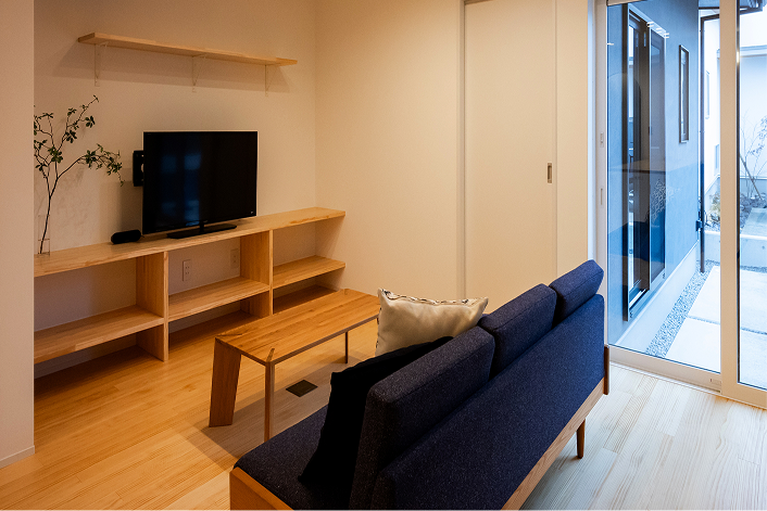 内部は自然素材を基調にまとめ、木のぬくもりを身近に感じられるデザインに。長方形に設計されたLDKは、18帖ながらも広さ以上のゆとりをもたらしてくれます。