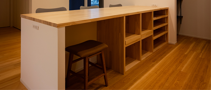 キッチン横には限られた空間を無駄なく活かす造作したカップボード兼ダイニングカウンターを設置。