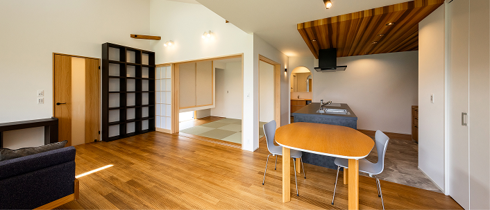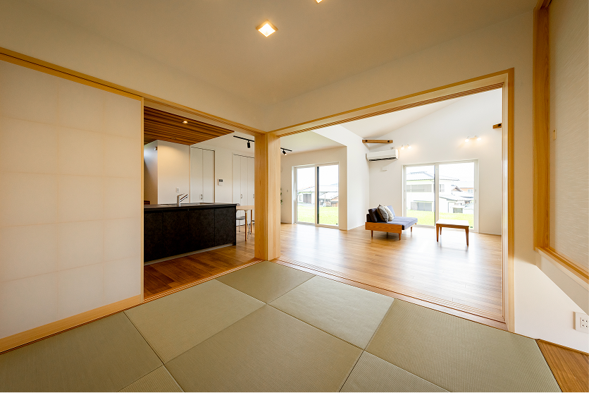 LDKの一角に設けた和室スペースは、障子を閉めれば落ち着いた個室に、開け放てば大らかな空間に。