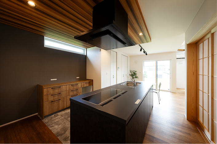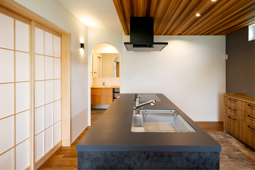リビングは高さのある勾配天井で開放感を、キッチンはレッドシダーの下がり天井で落ち着きを演出。用途ごとに表情を変えながらも、全体の調和は保たれています。