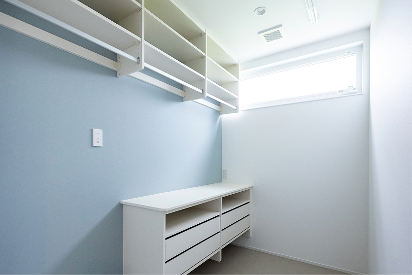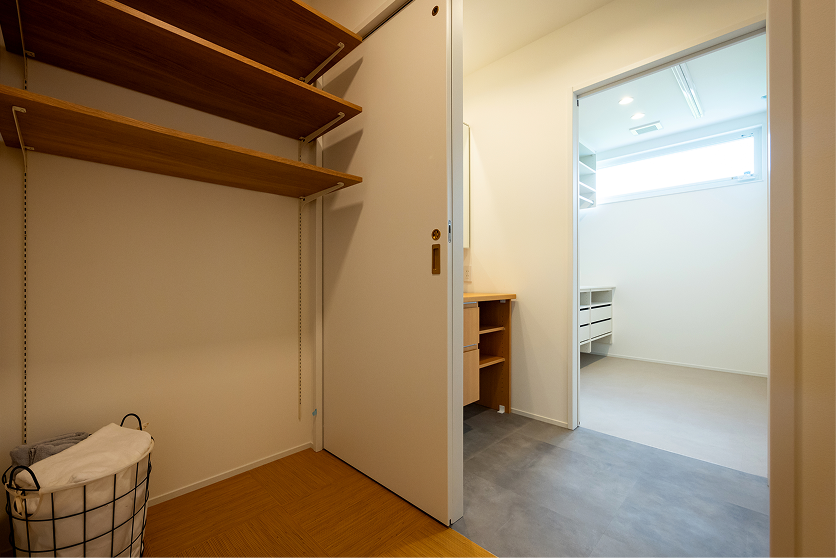脱衣所、洗面、ランドリールームが一直線に並ぶことで、流れるような家事ラク動線が叶います。それぞれをドアで仕切れるので、来客時も気兼ねなく使えるのが嬉しいポイント。