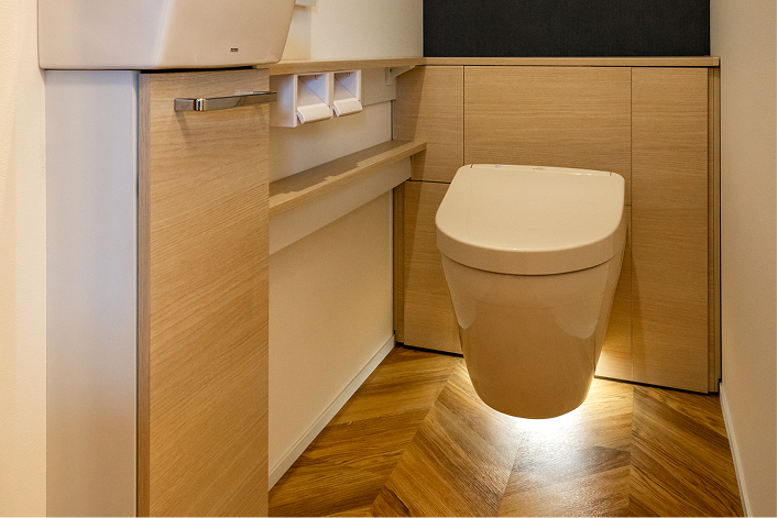 フロアライトが浮遊感を際立たせ、掃除もしやすく常に清潔。