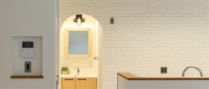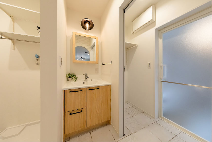 洗面、脱衣所、ランドリールームを並べたことで、家事動線をスムーズに。