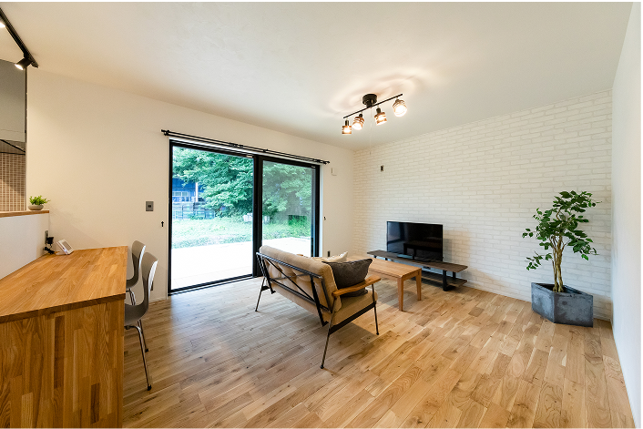 広々としたLDKは、自然の景色を取り込む1.5間の大きな窓が特徴。四季の移ろいを感じられる、伸びやかな空間です。