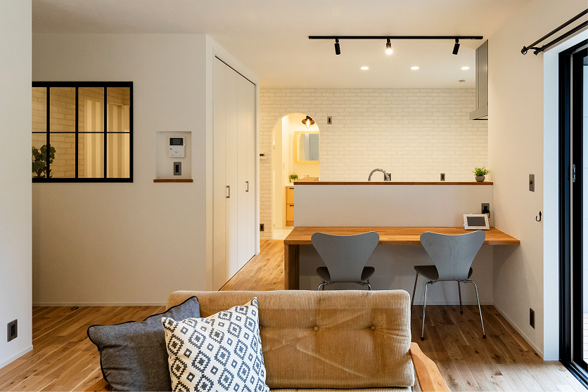 白×木目のナチュラルなトーンでまとめられた空間は、家族の時間を優しく包み込み、室内窓や垂れ壁のディテールも、見るたび嬉しくなるこだわりの設計です。