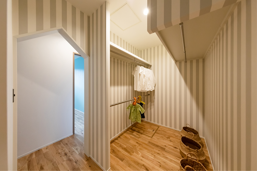 2.5帖のファミリークローゼットには、家族全員分の衣類をすっきり収納。広々設計で、子どもも自然とお片付けしやすく。 ワークスペースは、リビングにつながる小窓を設置。家族の様子を見守れる安心設計です。
